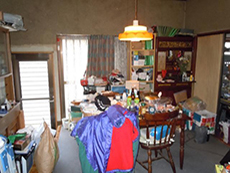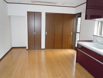 | こちらはリビングです。 奥にキッチンが見えています。 今ある壁を取り払い、広々としたリビングダイニングにしていきます。 |