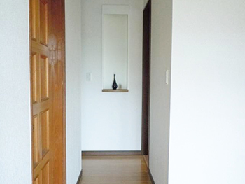 | 玄関から見た廊下です。奥には棚を設け、華やかな玄関になりました。 | 玄関横には鏡をつけました。 |