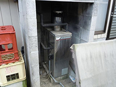 | 既存の給湯器を取り外し、施工後に使う砂が袋に準備されています。 | エコキュートの土台が準備され、壁からは配管がちょこっと見えているのがわかりますでしょうか? |