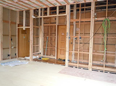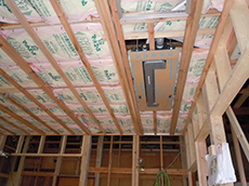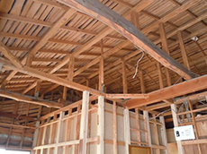 | 天井・壁を取り除き、柱・梁が見えています。 | 土間にコンクリートを流して基礎が出来上がりました。 | 天井には断熱材を敷き詰め、埋め込み型のエアコンが取り付けられました。 |