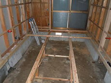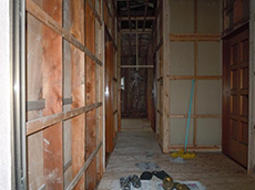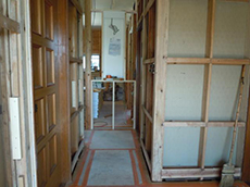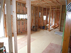 | 奥の部分が廊下になるところです。 | 写真が暗いですが、床板を貼り終えたところです。部屋の奥から、玄関方向を見て撮っています。 | 玄関から見た廊下です。奥には棚を作るために白っぽい木材で枠組みを作っています。 |