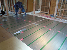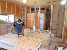 | 壁にも断熱材を敷き詰め、床板も貼り終わりました。徐々に部屋の形ができてきました。 | 床暖房用のシートを敷いているところです。冬でも足元からあったかに。 | 職人さんが、壁の板を切り出しているところです。 |