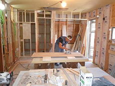 | 一枚一枚、丁寧に作業を進めていきます。 | 壁板も貼り終わり、後は壁紙、フローリングを貼れば完成です! |