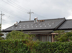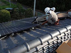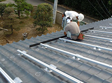 | 太陽光パネル設置工事の模様です。 | 瓦を外し、パネルを固定する器具をつけていきます。 | そこにパネルをのせる棒をセットします。 |